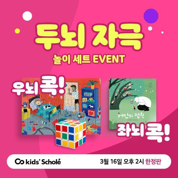 - 언제? 3월 16일 (화) 오후 2시부터! - 무엇을? 키즈스콜레 베스트 도서 1권 한정판 [더 그림책 브레인] 퍼즐 미니 큐브 - 어떻게? 링크 접속! 하단 신청란에 정보 입력 “선착순 한정 선물 받기” 클