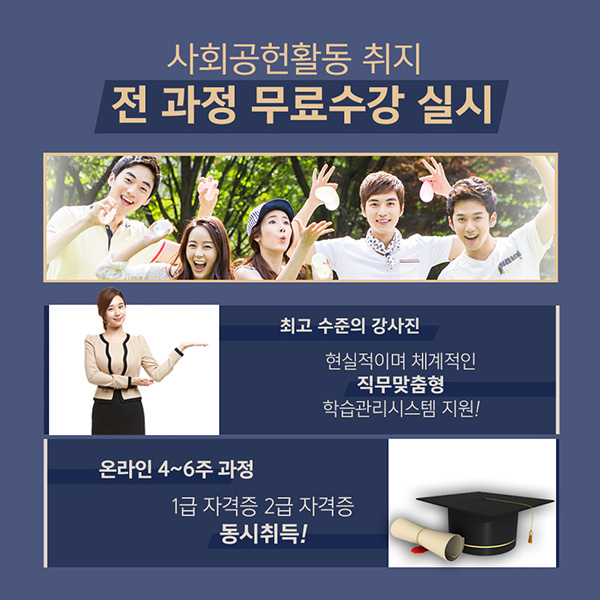 사회교육 중앙회에서 현재 이벤트로 회원가입만 해도 희망하는 3가지 자격증까지 무료 수강 신청 가능합니다! 심리상담사 자격증·아동청소년 교육지도 분야 자격증들을 온라인 수강료 30만 원