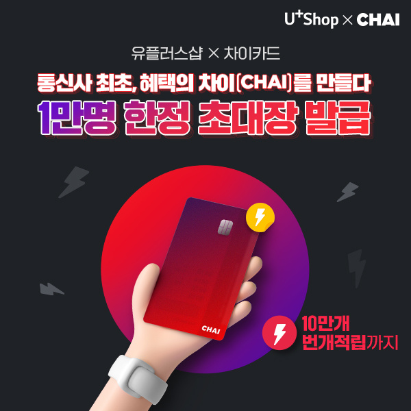오늘은 여러분들을 위해 유플러스샵과 차이카드 제휴 이벤트소식을 알려드리려고 해요! 국내 통신사 최초로, 유플러스샵이 이 어려운걸 해냈습니다. 지금 유플러스샵에서 선착순 10,000분께 차