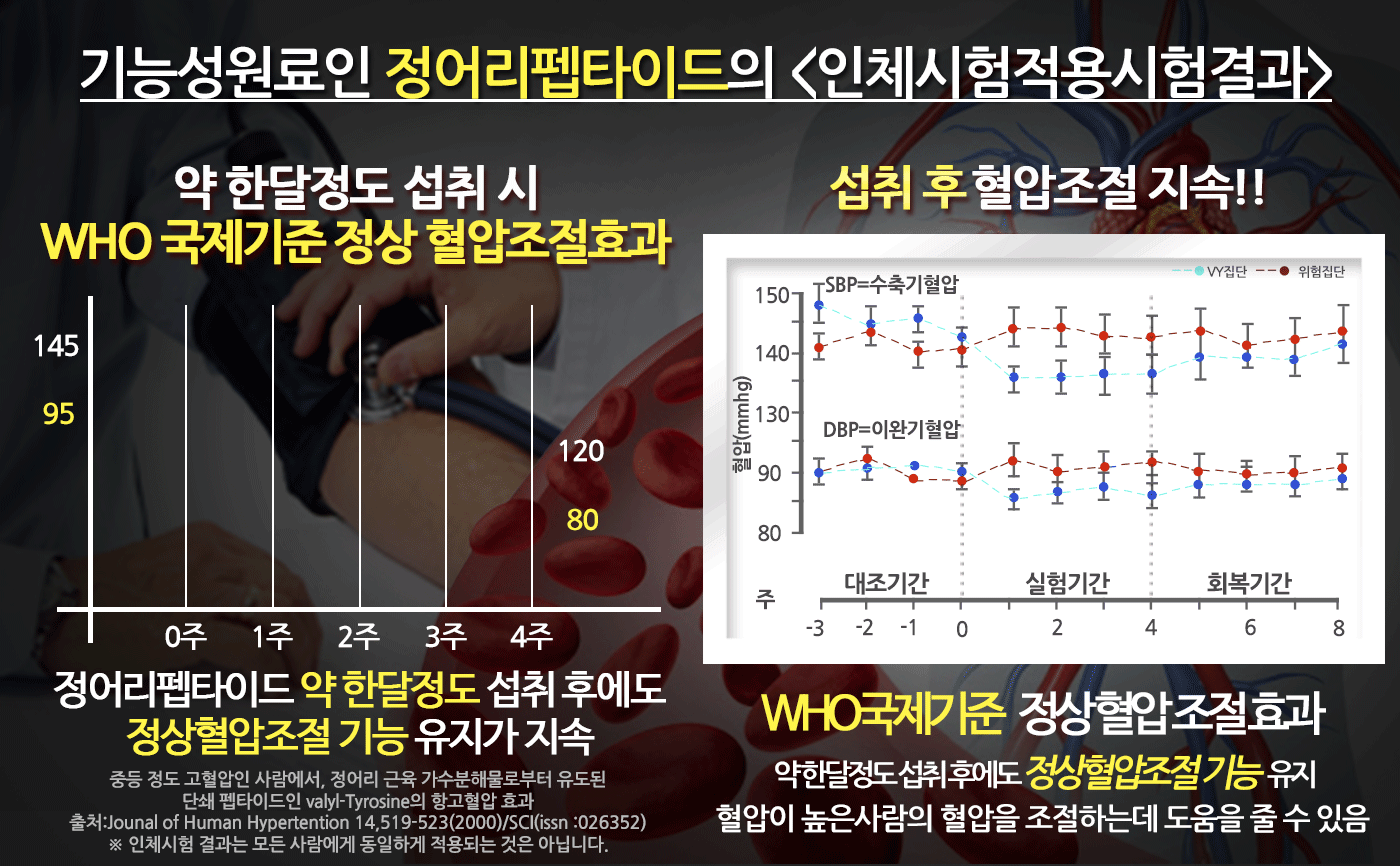 약 한달정도 섭취시 WHO국제기준 정상혈압조절 효과가 나타났으며
