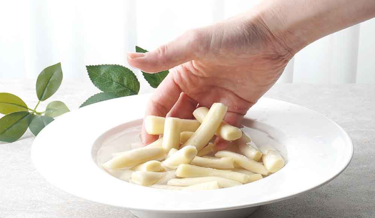 해동된 떡은 물에 씻으면서 하나하나 분리해 주세요.