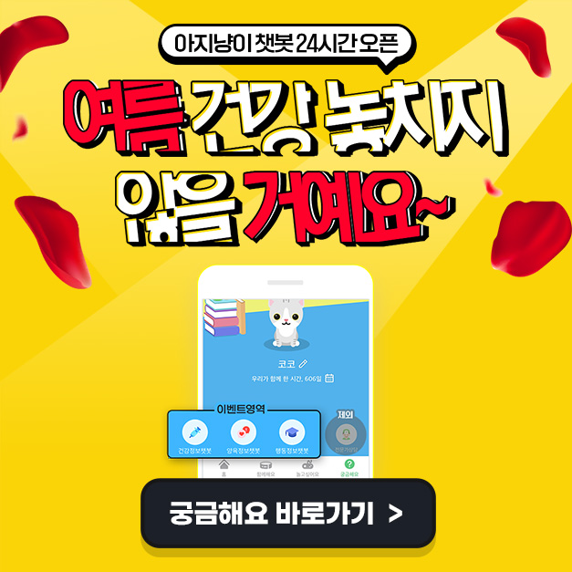 아지냥이 챗봇 24시간 오픈! 여름철 아지,냥이에 대한 상담받고 건강진단키트 챙기자! [EVENT] 행사기간 동안 '궁금해요'내 챗봇을 이용하고 '만족도 평가하기'를 통해 평가를 남긴 회원 중 추첨을