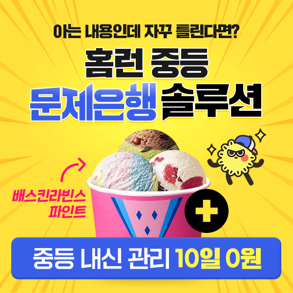 아는 내용인데 자꾸 틀린다면? 아이스크림 홈런 문제은행 솔루션으로 해결! 시험에 나올 문제, 내가 자주 틀린 문제 유형만 골라서 미리 풀어보자! 홈런 중등에서는 시험 기출문제와 정답풀이가
