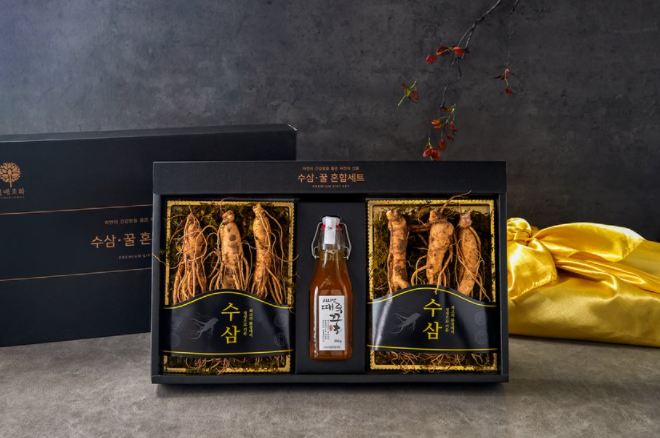수삼과 때죽 꿀을 함께 담은 품격 있는 선물 세트를 만나보세요.