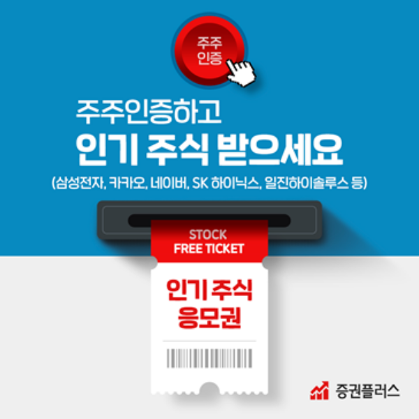 총 1억 원 상당의 주식선물! 증권플러스 주주 인증 리그 오픈! 삼성전자, 카카오, SK하이닉스, 네이버, 카카오 뱅크, 일진 하이솔 루스 등, 경품 라인업부터 역대급! 총 1억 원의 인기 주식받을 주