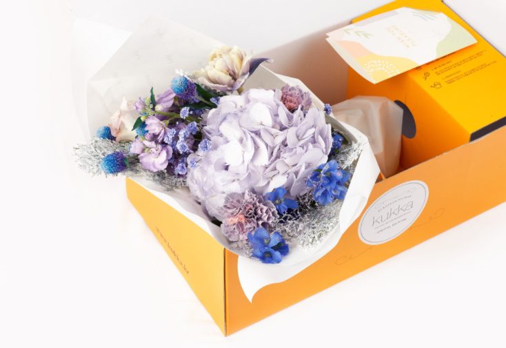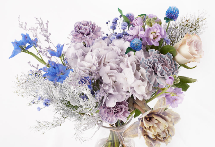 풍성한 화형의 라벤더 수국과 염색 겹튤립을 담아