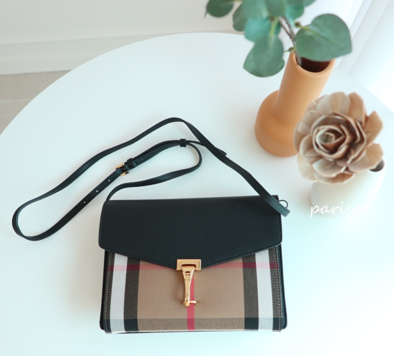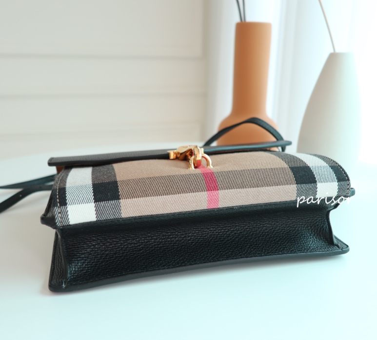 버버리 기본 하우스 체크와 블랙 가죽이 어우러져 고급스럽고 간편하게 숄더, 크로스 모두 가능한 제품입니다.