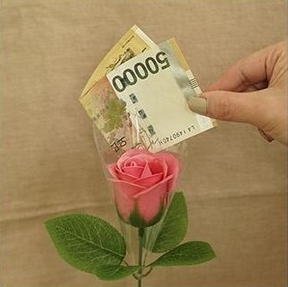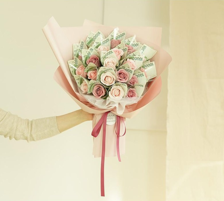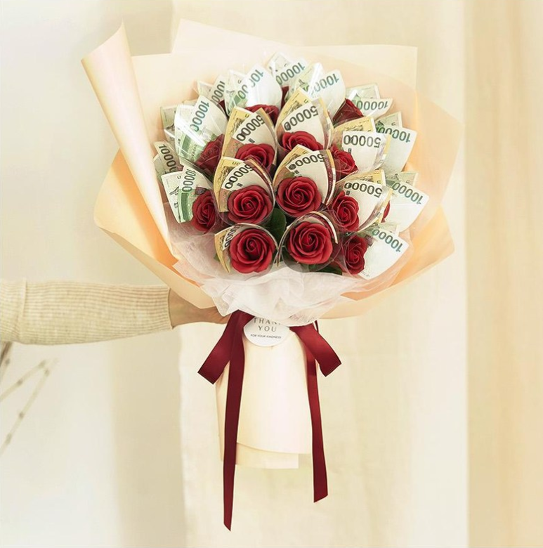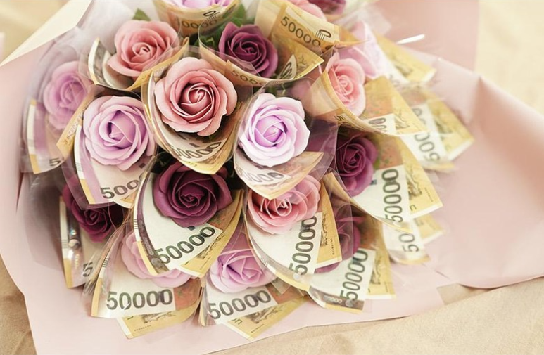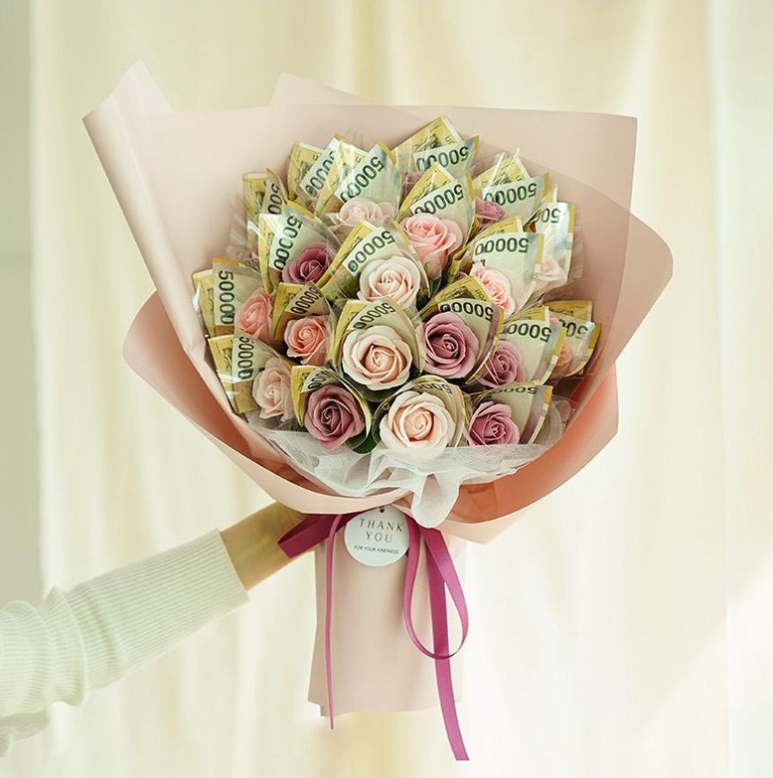 향기로운 비누꽃 꽃다발과 용돈 선물의 구성