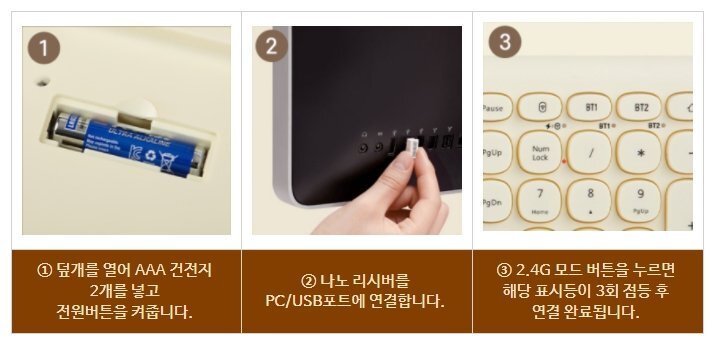페어링 후 간단하게 2.4G, BT1, BT2 버튼을 눌러 모드간 전환이 가능합니다.