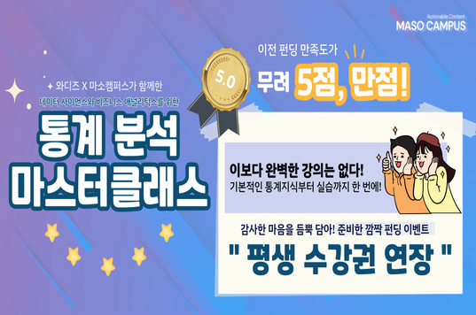 [마소캠퍼스 X 와디즈] 앵콜! 데이터 사이언스와 비즈니스 애널리틱스를 위한 통계분석 마스터클래스 이전 펀딩 만족도가 무려 만점?! 마소캠퍼스의 인기 강의 "통계 분석 마스터클래스"가 앵콜