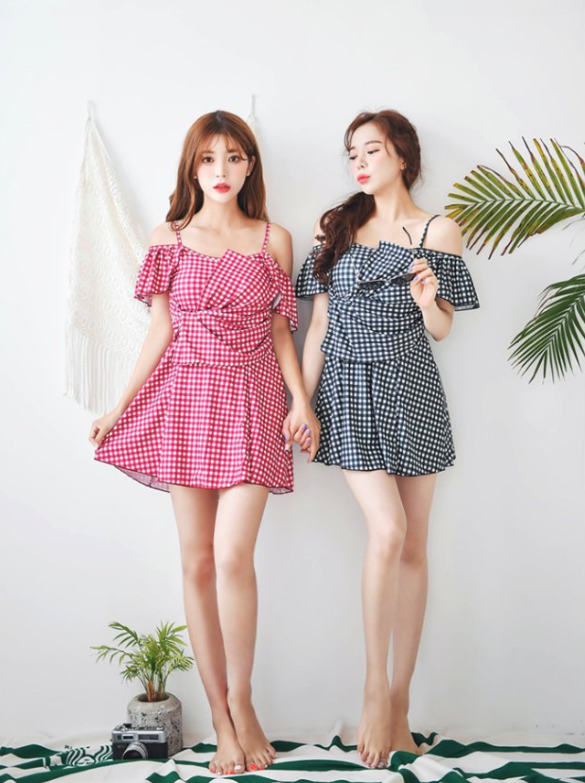체형은 가려주고 귀여움과 여성스러운 매력은 한껏 살린 오프숄더 체크원피스 수영복입니다.