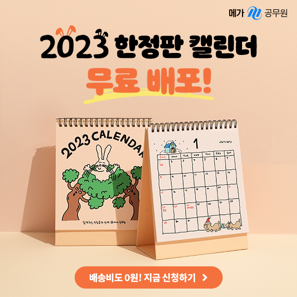 메가공무원 회원 누구나, 배송비까지 무료! 지금 2023 캘린더 신청하고 수험생 굿즈까지 챙겨가세요!