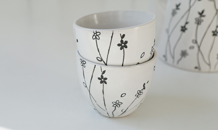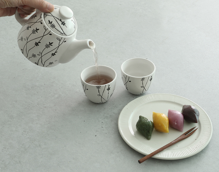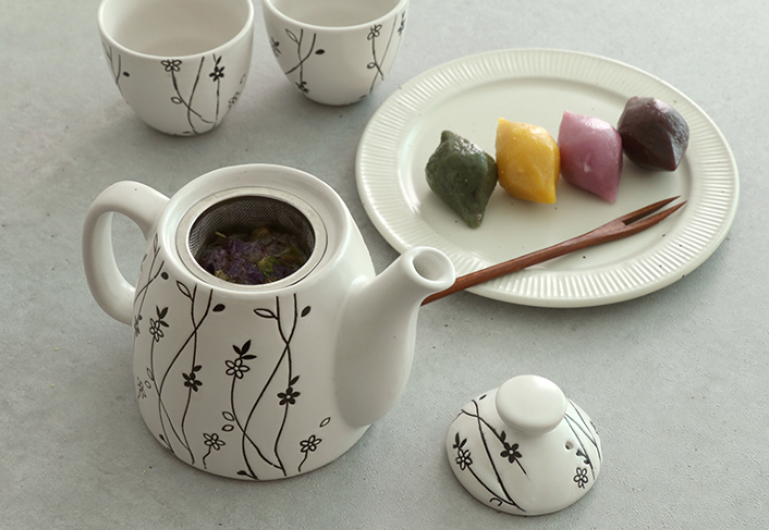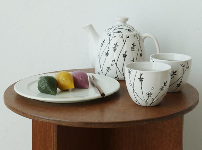 하얗고 까만 꽃송이와 줄기가 음각처리된 고급스러운 다기세트입니다.