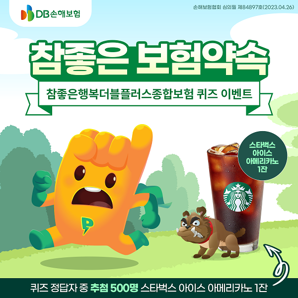 [DB손해보험 참좋은 보험약속 퀴즈 이벤트] -이벤트기간 : 4/27 ~ 5/22 -경품 : 퀴즈 정답자 중 추첨 500명에게 스타벅스 아이스 아메리카노 1잔 -카카오톡 상담 통해 보장분석 완료 시 신세계 상품권 1