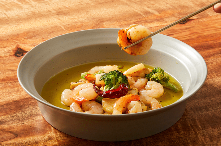 소금과 후추로 간을 한 새우를 건고추와 함께 올리브 오일에 넣은 감바스에