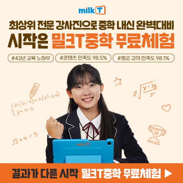 앞서가는 공부, 압도적인 성적 상승 밀크T중학 시작하세요