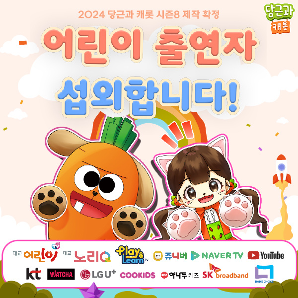 당근과 캐롯에 함께 출연할 4-13세의 어린이 출연자를 모집합니다! 사진 찍는게 좋은 어린이 춤과 노래를 사랑하는 어린이 재밌는 영어 공부가 하고 싶은 어린이 모두 모여라~ - 지원 연령: 4세~13