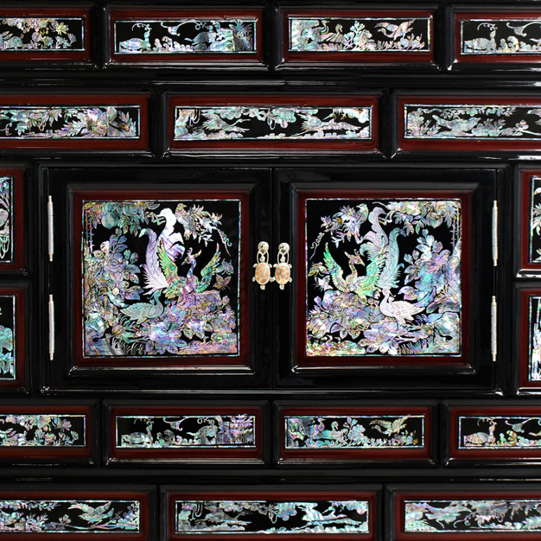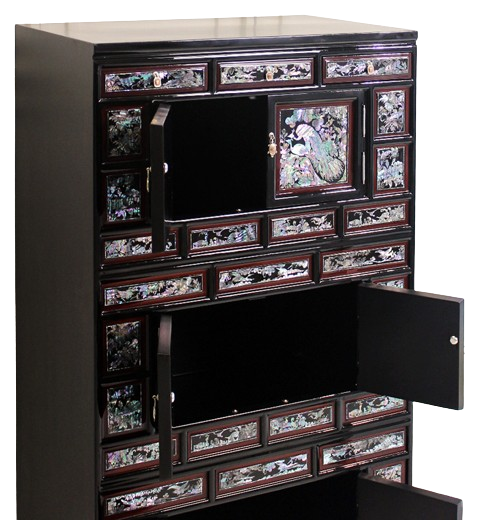 자개의 화려함이 담긴 삼층장입니다.