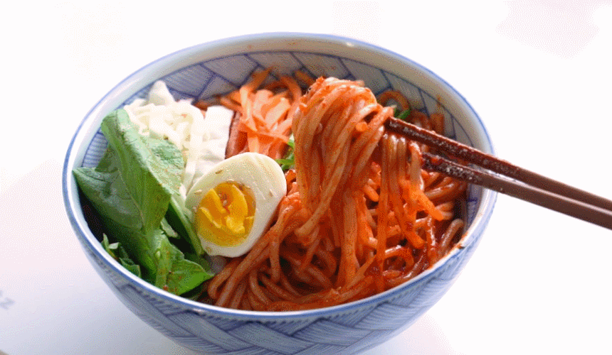 ④ 쫄면사리를 그릇에 담고 쫄면 소스를 넣어 비벼주시면 맛있는 쫄면 완성