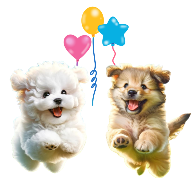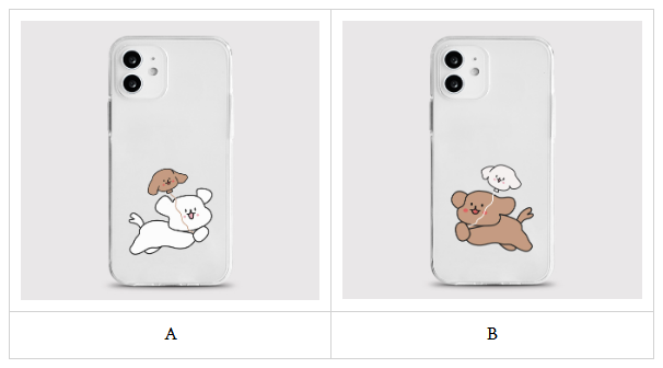 서로의 모습을 한 풍선을 들고 뛰는귀여운 댕댕이가 그려진 커플젤리케이스입니다.