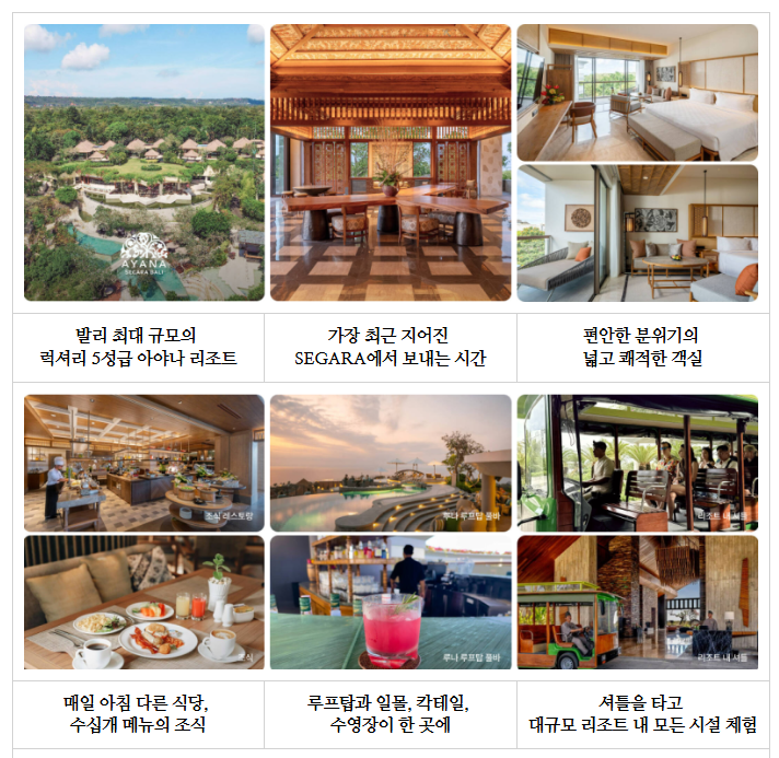 아야나 세가라 리조트 2박, 우붓 웨스틴 리조트 2박, 꾸따 4성 호텔 1박