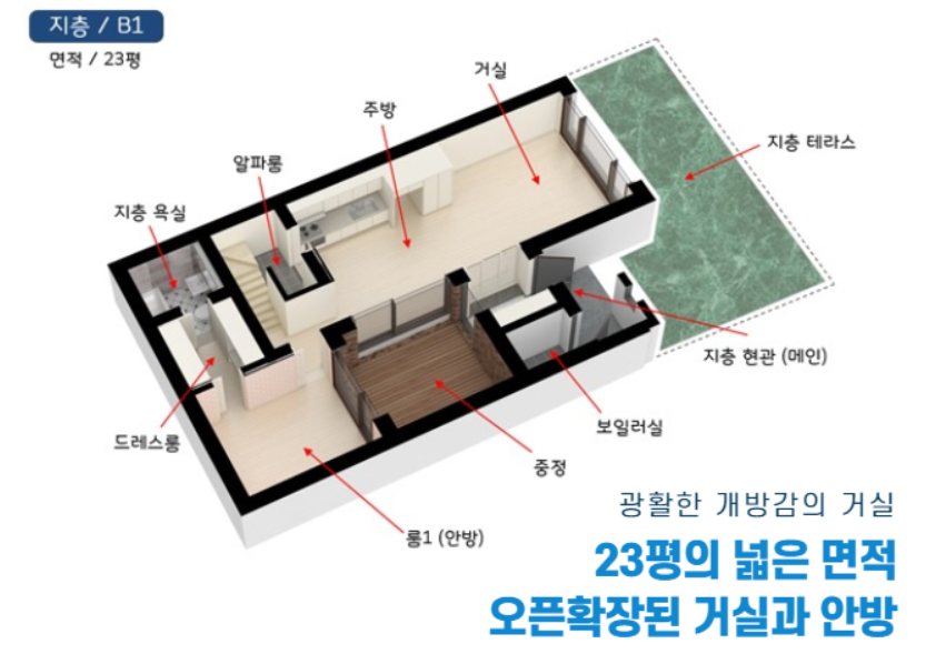 1층(23평) 안방, 거실, 주방, 중정, 욕실, 드레스룸, 알파룸