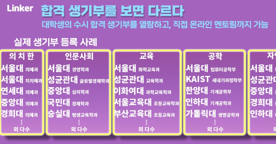 Linker! - 오직 링커만이 가능합니다.(특허 출원) 모바일로 언제 어디서나 - 1,200여 개 합격 생기부와 자소서 열람(특허 출원) - 합격자가 직접 작성한 입시 정보 - 수험생이 질문을 하면, 대학생이 10