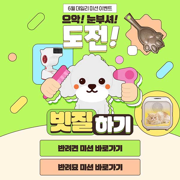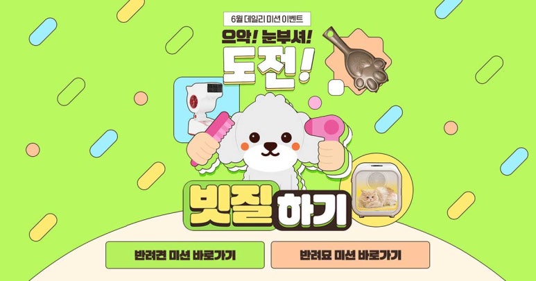 부지런히 빗질하면 데일리미션 행운! 우리 아지, 냥이의 비단결 같은 털 관리를 위해 오늘도 빗질 GO! [EVENT] 행사기간 동안 아래 참여방법을 통해 데일리미션에서 빗질하기 미션 알림을 설정하고