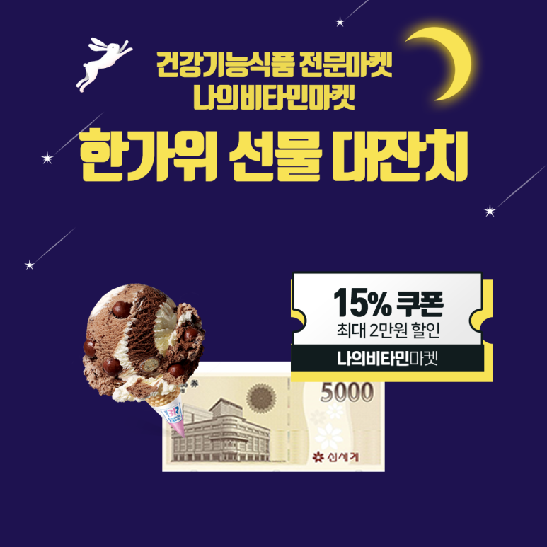한미 헬스케어 직영몰, 나의 비타민 마켓 풍~성한 한가위 혜택 받고 영양제&건강기능식품 선물 구매하세요! [9월 신규 가입 선물] 1. 매일 선착순 배스킨라빈스 싱글레귤러 기프티콘 증정 2. 가입