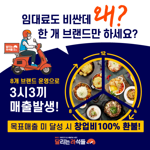외식업계 최초 창업비 100% 전액 환불! 아직도 한 매장에서 한 브랜드만 운영하세요? 샵인 샵 배달창업 아이템 No.1 "달리는려석들"로 성공할 준비 되셨나요? 단일 매장, 복합 브랜드 컨셉의 달리는