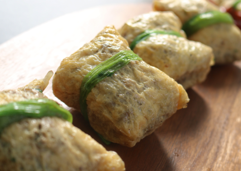 미나리로 정성스럽게 하나하나 손으로 묶은 유부보따리입니다.