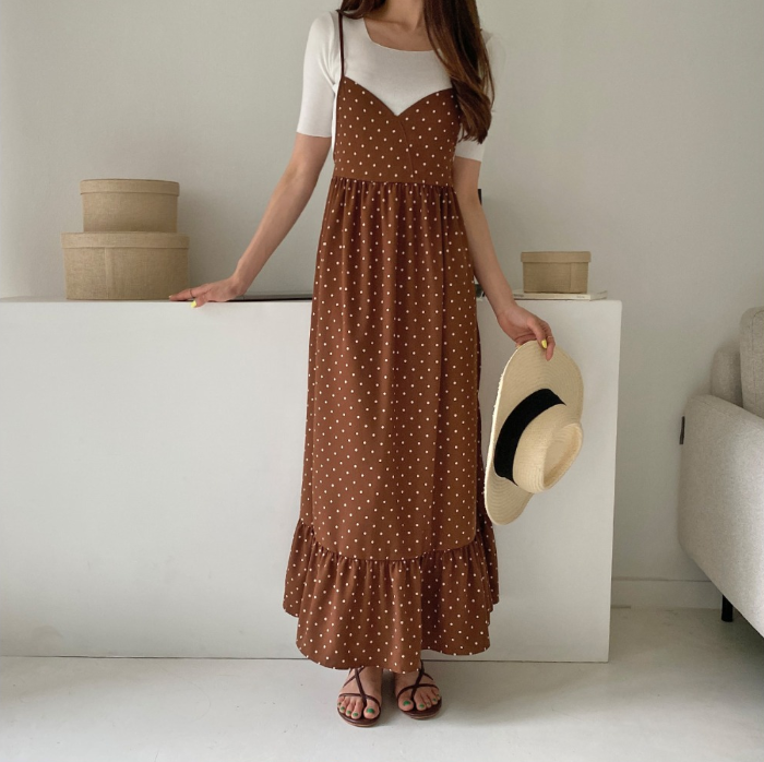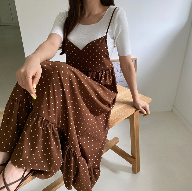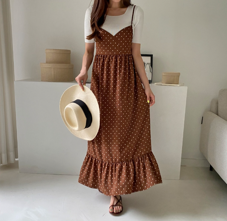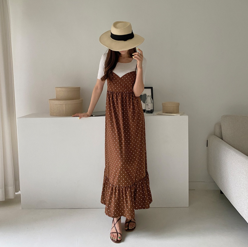 꾸안꾸 스타일로 데일리룩으로 휴가지 패션으로도 예쁜 도트 나시원피스입니다.
