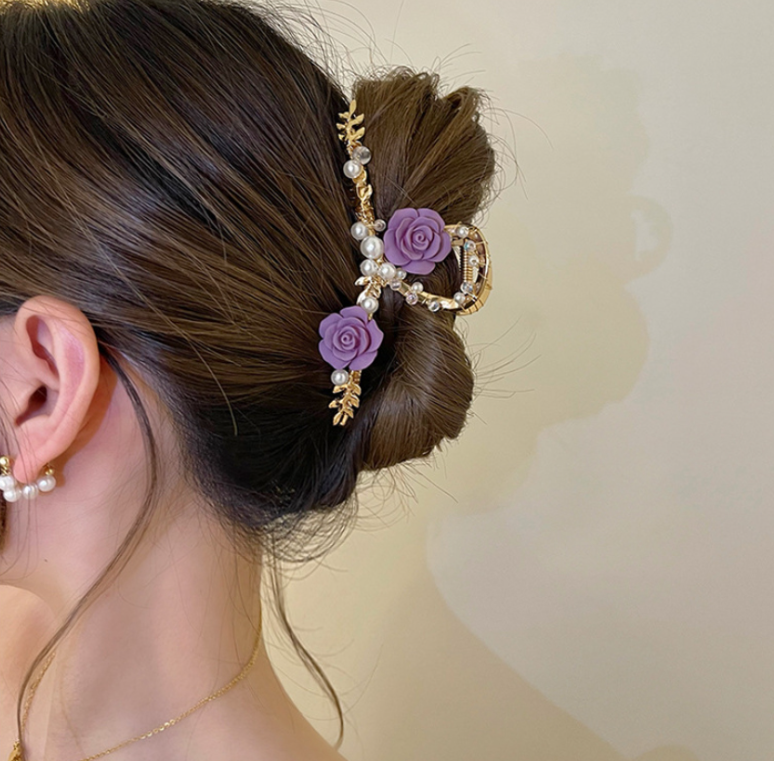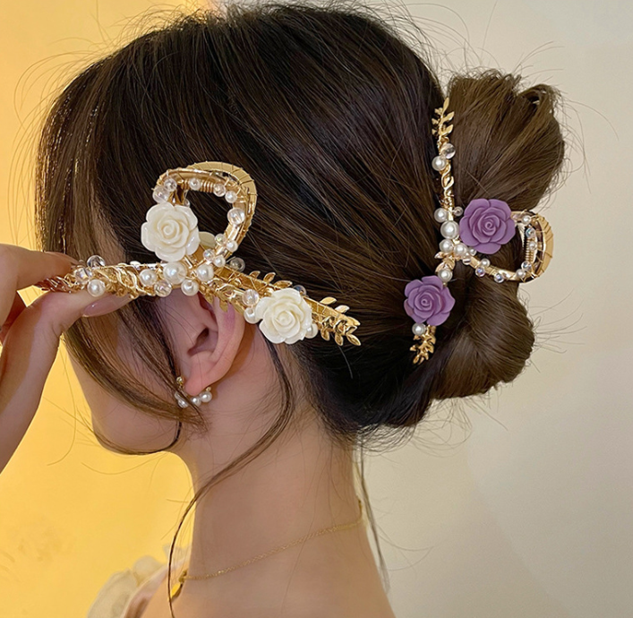 진주 로즈 큐빅 포인트 디자인의 메탈 헤어집게핀입니다.