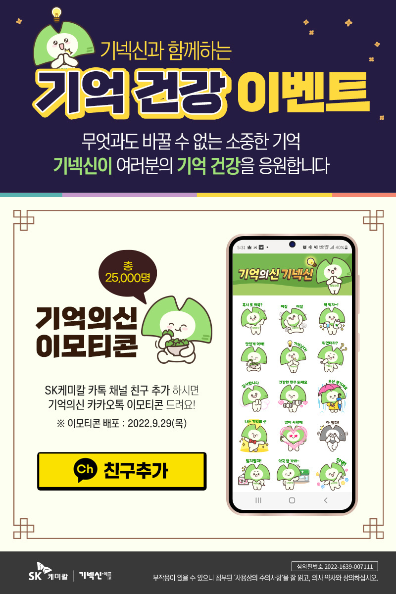 SK케미칼 카톡 채널 추가하고 기억의신 이모티콘 받으세요.