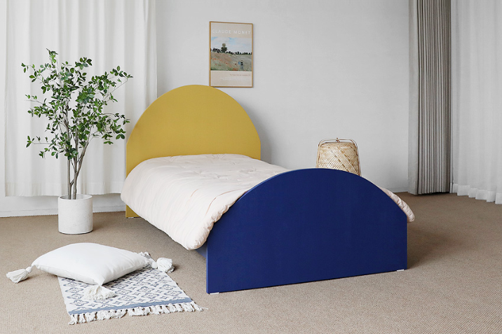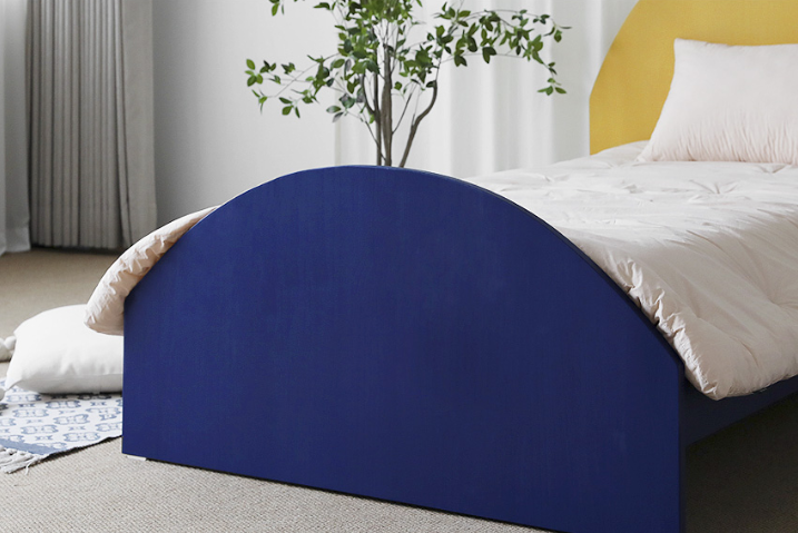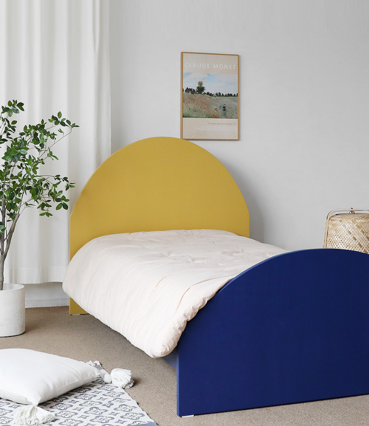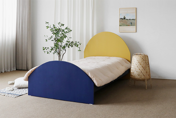 반구형태로 라운딩한 헤드와 풋보드 디자인이 감성적인 분위기의 침대 프레임입니다.