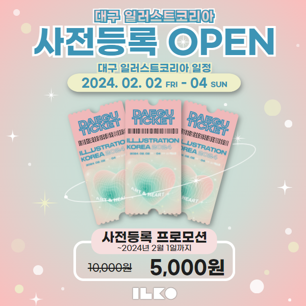 대구 유일 일러스트페어 '대구 일러스트코리아' 구경가자! 전시명 : 2024 대구 일러스트코리아 전시 일정 : 2024. 02. 02(금) - 04(일) 개최장소 : 대구 엑스코 파트너사 : 젤리크루 illustration is Art&Heart